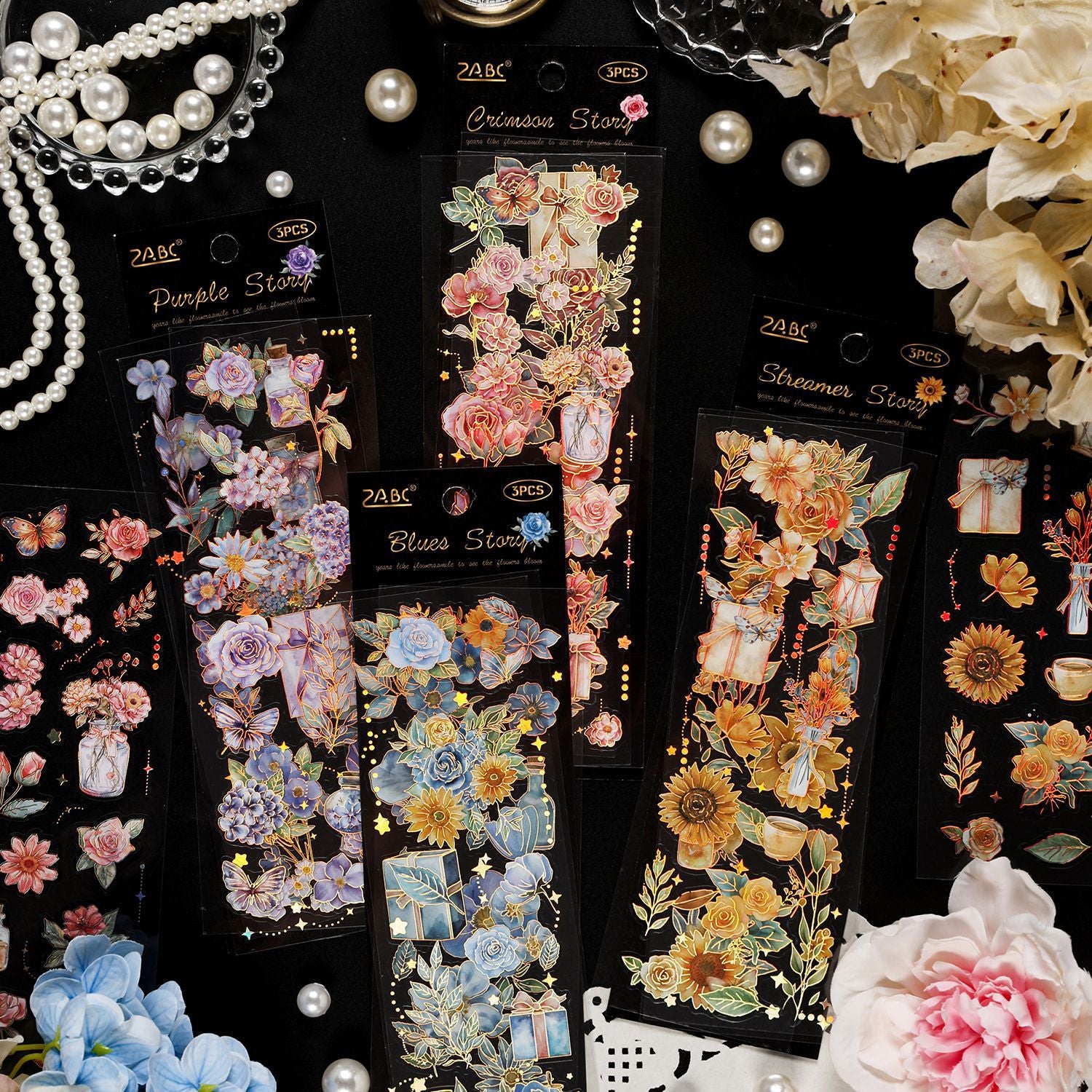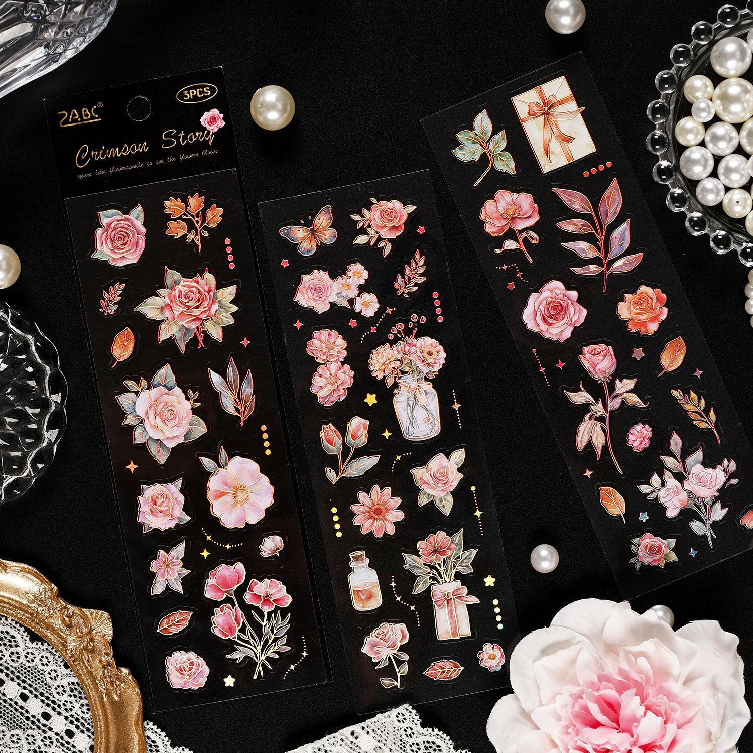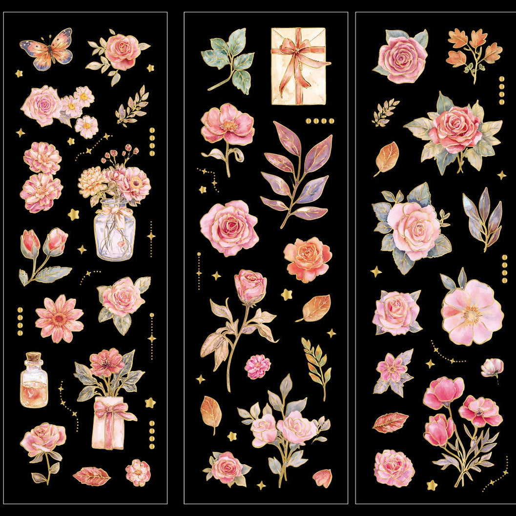 - Elevate your crafts with these exquisite gold foiled stickers! Each set showcases three delicate floral designs with precision-cut edges. Moreover, the shimmering gold foil creates stunning contrast on transparent PET. Therefore, your projects instantly gain luxurious dimension and elegance.